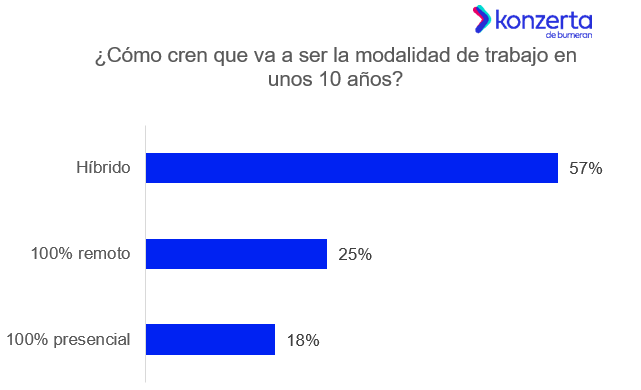 Al consultarles respecto a la modalidad de trabajo en un futuro, el 57% de los especialistas en HR cree que la modalidad en 10 años será principalmente híbrida; el 25% cree que será 100% remota; y el 18% afirmó que será 100% presencial.