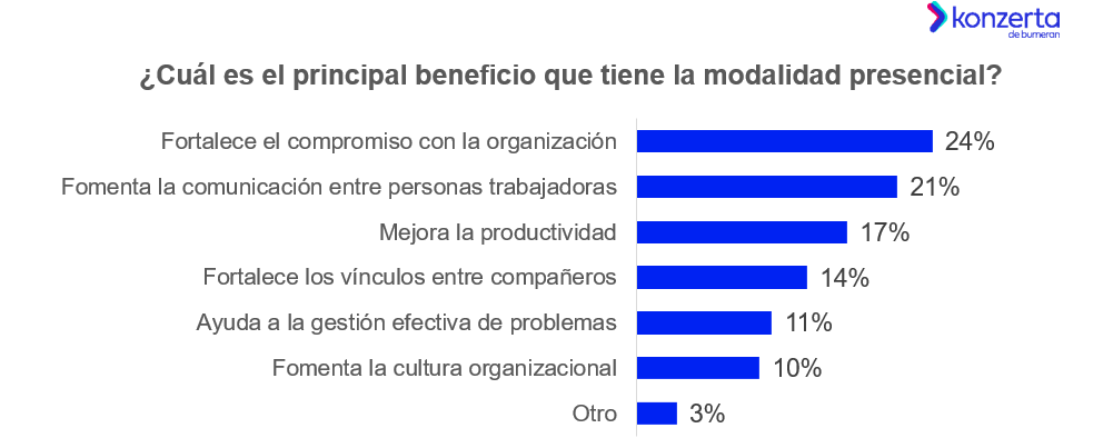 Entre quienes prefieren trabajar bajo una modalidad presencial el 63% dice que los ayuda a mejorar la comunicación y el trabajo en equipo; el 61% que permite un mayor aprendizaje y desarrollo profesional; el 42% que permite tener mejor interacción y conexión con colegas; el 39% que es más productivo; el 37% que tiene acceso a herramientas y recursos de la empresa; el 33% que le ayuda a mantener la rutina laboral; otro 33% que tiene mayor facilidad para separar trabajo y vida personal, el 24% que tiene menos distracciones que en casa y 22% hay más oportunidades de networking y visibilidad en la empresa.