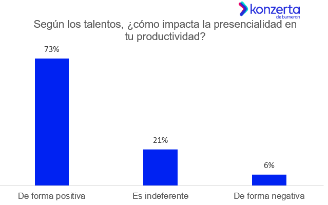 El 73% de los talentos dice que la presencialidad impacta positivamente en su productividad; el 21% menciona que es indiferente; y el 6% dice que el impacto es negativo.