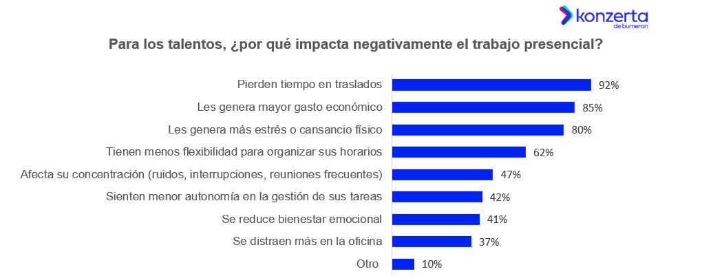 ¿Por qué impacta negativamente? El 92% de las personas trabajadoras dice que pierden tiempo en traslados; el 85% que les genera mayor gasto económico; el 80% menciona que les genera más estrés o cansancio físico; el 62% que tiene menos flexibilidad para organizar sus horarios; el 47% que afecta su concentración; el 42% sienten menor autonomía en la gestión de sus tareas; el 41% indica que se reduce su bienestar emocional; el 37% señala que se distrae más en la oficina y un 10% menciona otras razones.