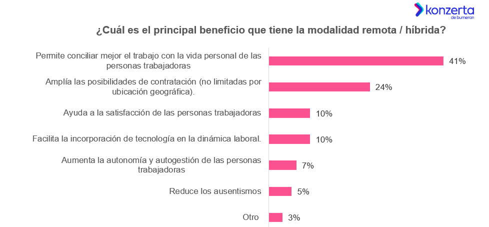 Por otro lado, entre los beneficios que tiene la modalidad remota o híbrida, el 41% de los especialistas reconoce como principal beneficio que permite conciliar mejor el trabajo con la vida personal; el 24% dice que amplía las posibilidades de contratación; el 10% que ayuda a la satisfacción de las personas trabajadoras; otro 10% que facilita la incorporación de tecnología en la dinámica laboral; el 7% que aumenta la autonomía y autogestión de las personas trabajadoras; el 5% que reduce los ausentismos; y el 3% menciona otras razones.