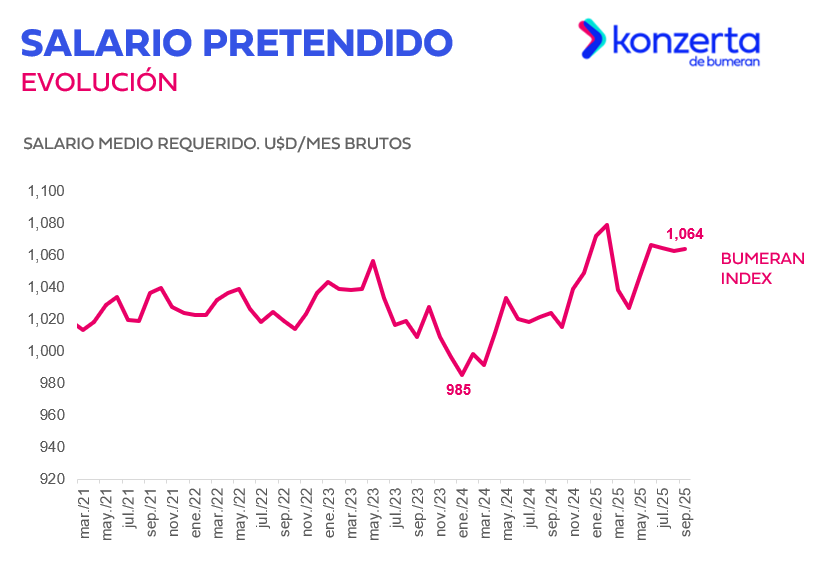 El salario promedio pretendido en septiembre fue de $1,064, lo que representa un incremento de 0.15% con respecto al mes anterior. En la comparativa interanual el salario registra un aumento del 3,95% respecto a septiembre del 2024.