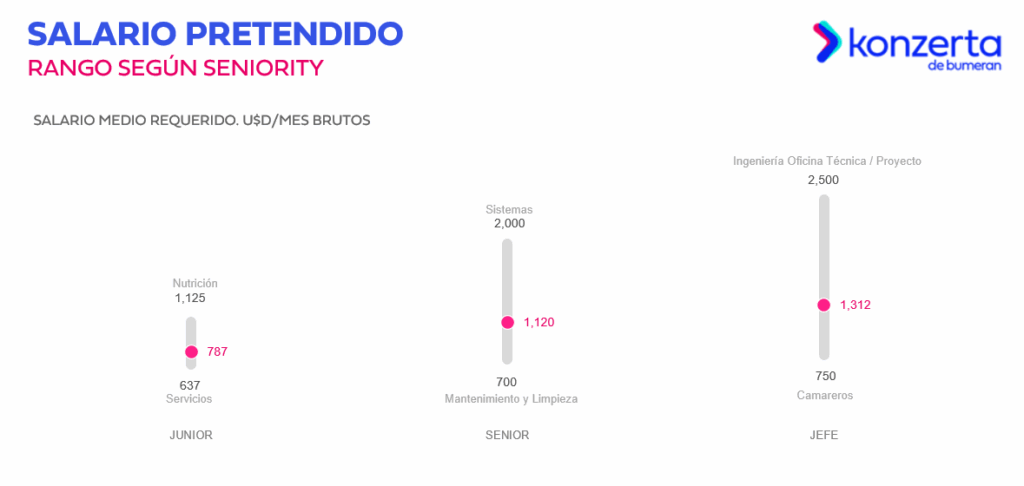En las pretensiones más bajas se ubica el puesto de Camareros con $750 para el segmento de jefe; Mantenimiento y limpieza con $700 en la categoría semi senior y senior y en el nivel junior el puesto de Servicios con una aspiración salarial de $637.