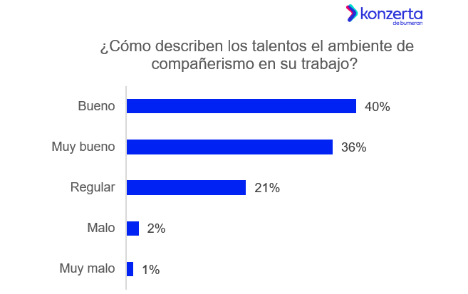 ¿Cómo consideran el ambiente de compañerismo en su trabajo? El 76% de los talentos menciona que el ambiente es bueno o muy bueno; el 21% menciona que el ambiente es regular; el 2% lo considera malo; y el 1% muy malo.