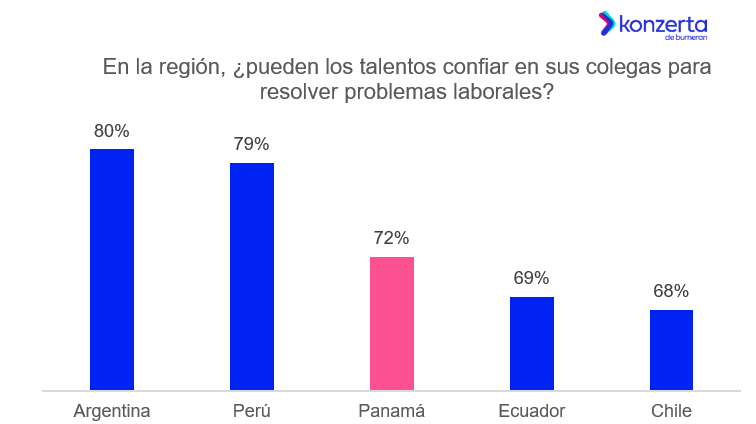 El 72% de los talentos dice que puede confiar en sus compañeros de trabajo para resolver problemas laborales, frente a un 28% que indica que no confía. En la región la tendencia es similar: en Argentina el 80% de los talentos menciona que puede confiar en sus compañeros; Perú el 79%; en Ecuador el 69%; y en Chile el 68%.
